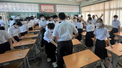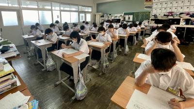 テスト終了。解答用紙と問題用紙を回収します。