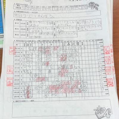 テスト中、ふと目をやると家庭学習を記録したプリントがあります。