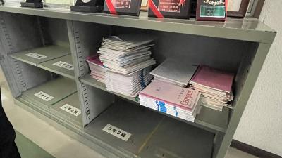 職員室前の棚に、ノートやワークブックを置いています。