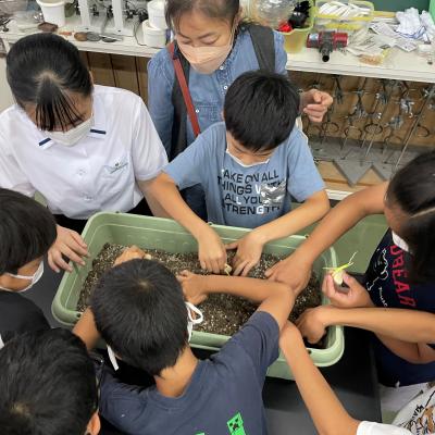 発表の後、昨年度とっておいたはまゆうの種を小学生に植えてもらいました。