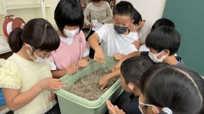 砂からマイクロプラスチックを取り出す方法を説明し、小学生にも実際に取り組んでもらいました。